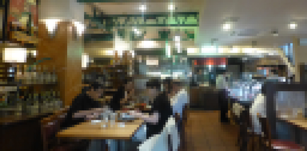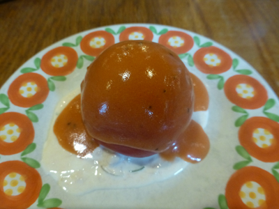 店内。(ぼかしてある)左 百年洋食ハンバーグのCセットを注文。 まず、トマトサラダ。皮をむいたトマト丸ごと1個に、トマトドレッシングをかけたもの。 この日のトマトは北海道の平取(びらとり)産と説明があった。 |