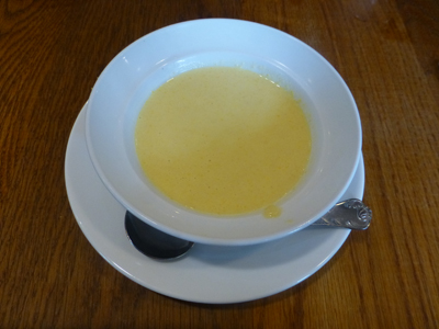 冷たいコーンスープ。皿が深くて、見た目よりも量が多い。 下 百年洋食ハンバーグは、アルミ箔に包まれてやってきた。アツアツなので、アルミ箔はナイフとフォークで破る。それとご飯。ご飯はお代わり無料。 |