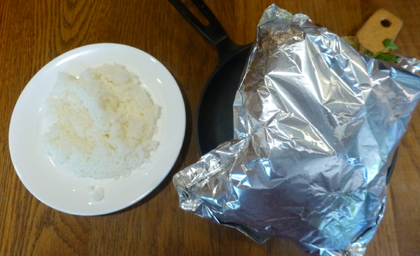 アルミ箔を開けると百年洋食ハンバーグが姿を現す。ベイクトポテトも。ハンバークの上にはさいころ型の肉が乗っている。 |