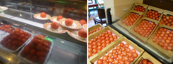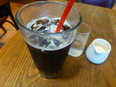飲物はアイスコーヒー。下 店内には、皮をむいたトマトと、皮のついたままのトマトが大量に置いてあった。 |