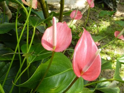 アンスリウム。花に見える赤い部分は、仏炎苞(ぶつえんほう)という葉らしい。里芋科にはあるという。花は、細長い部分だけとのこと。 |