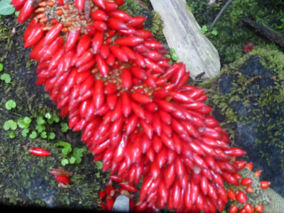 ホソバウチワ。赤唐辛子のような小さな実が集まって、大きな実になっている。 |