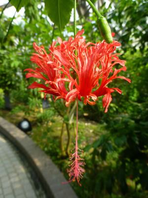 風鈴仏桑花(フウリンブッソウゲ)。ハイビスカスの仲間で、垂れ下がっている部分がある。 |