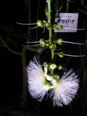 サガリバナ。昼夜逆転室にあった。夜には明かりをつけ、昼は暗くしている。サガリバナは夜に咲いたあと、朝には枯れてしまうので、この部屋のおかげで、花を見られてよかった。 |
