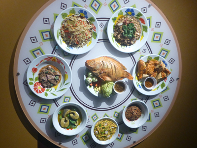 タイ料理のコーナー。これはイサーン料理だが、各地の料理を展示している。うまくやっていたのは、料理コーナーのそはにタイ料理を何種類か販売する店があり、スパイシーなにおいが立ち込めていたこと。 |
