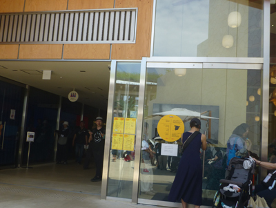 昼食をとりに、スペイン館のレストランへ。左がスペイン館の見学者の出口。右がレストラン。 11時30分から並んだが、1時間並び、入れたのは12時30分。今回はパビリオンはなるべく並ばないつもりだったが、レストランだけは例外。 |