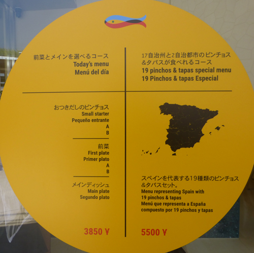 前回、スペイン館を退館したさい、このメニューを見ていた。スペインを代表する19種類のピンチョス&タパス。これを食べるつもりだった。 ところが、この料理は、席のメニューで1日50食と判明。売切れで食べられす、写真左側のコース料理に変更。 |