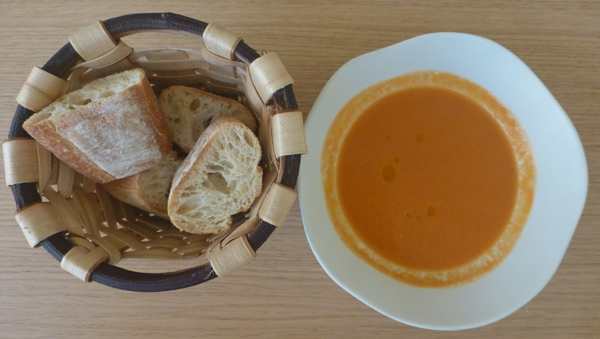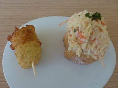 ピンチョス。チーズを揚げたものとカニカマのマヨネーズ和えをのせたもの。 下 パンとガスパッチョ。 |