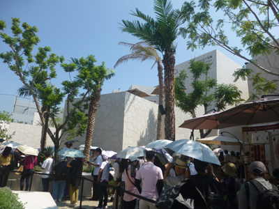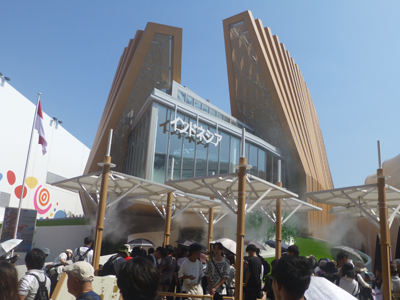 サウジアラビア館。砂漠のオアシスで見られる煉瓦づくりの民家やヤシ科の木をイメージしたようなパビリオンだ。 20分ほど並んだ。 |