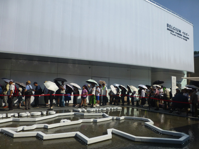 ベルギー館。写真の一番下はベルギーの地図で、大きく手前と向う(行列に並ぶ人たちの下側)の2つにわかれているが、オランダ語地域(フランドル)とフランス語地域を表しているという。 並び方を見誤り、ここは40分ほど並んだ。 |