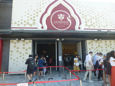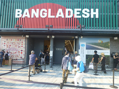 バングラデシュ館。並ばずに入れた。ここの前のセネガルもだが、国旗をイメ―ジした入口上の看板はわかりやすい。 |
