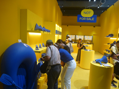 ウクライナのブース。体験するには、1時間以上待たねばならず、ブースの入口で様子を見ただけだが、写真を載せておく。ウクライナ国旗の青色をしたいくつかのグッズが黄色のブースに置かれている。たとえば左のボートや台の上の拡声器など。店のよう構えなのだが、「Not For Sale」と書かれている。 各グッズのバーコードを読み込むと、戦時下の生活の状況がスマートフォンに映し出される仕組みだ。 |