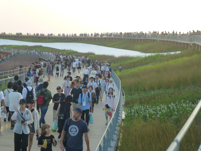 18時前でパビリオンめぐりを打ち切り、大屋根リングに上ってみる。大屋根の上の通路は、内側と外側の2本あり、何ヶ所かで合流しているが、その箇所は多くない。 太陽が低くなり、まだ暑いながらも、少しマシになって、大屋根の上は人が多い。 |
