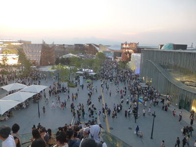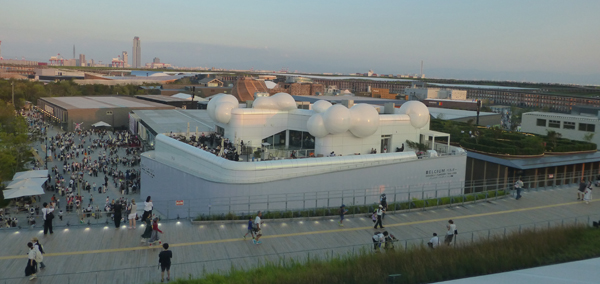 西側は海で太陽が低くなっている。暗くてわかりにくいが、西ゲートが見える。このしばらくあと、太陽は雲の中に入った。 下 昼間、入館したベルギー館の屋上はこんな感じだったんだ。 外側の大屋根リングから内側のリングを見下ろし、その向こうがパビリオン群。 |