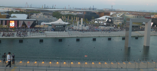 上 ウォーターショーが行われる池とその向こうのパビリオン群。(この時点では、ウォーターショーってイベント自体あることを知らなかったのだが、)左 大屋根リングは、南側半分を歩き、下に下りた。 |