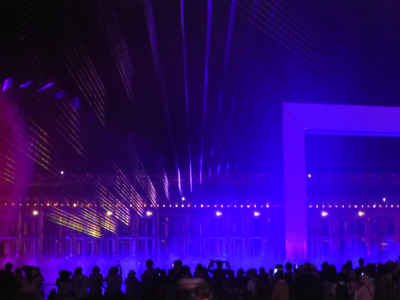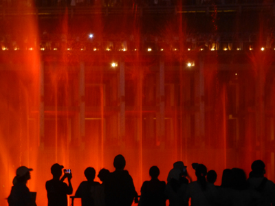 花火のあと、5分ほど間を開けて、19時30分からウォーターショーが始まる。噴水とライト、音響を使った演出だった。何回かは炎も出た。横に並ぶ光は大屋根リングの外側。風のため、見学しているところまで、水が飛んでくるのだが、それも涼しくてよかった。 |