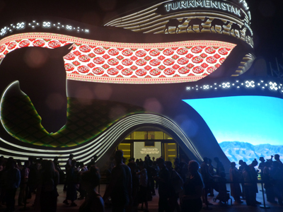 最後にもう1館、見て行くことにし、ウォーターショーを見ていたそばのトルクメニスタン館へ。暗い中で派手に輝いている。10分並んで入館。 今回の訪問は15館になった。(スペイン館は含めず)過去2回は12館、13館だったので、合せて40館になった。 今回多いのは、同行者がいるので、人気があり、長い行列のある館は避けたから。 |