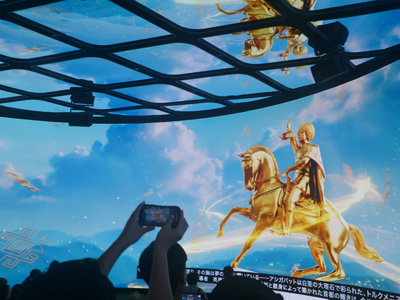 入館すると正面に大統領の肖像画がでんと飾られている。"中央アジアの北朝鮮"と称されるだけのことはある。次いで天井まで映し出されるビデオ。自然や伝統文化を紹介。金色で馬に乗る偉人や白亜の大統領宮殿を見ると独裁国の雰囲気を感じる。20年以上前に訪問した時のことを思い出した。 このあと、上の階に行き、物産や日本語の教科書などを見て、20分ほど滞在したが、見ごたえのあるパビリオンだと思った。 |