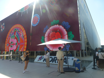 韓国館。11時ごろだったが、まだ30分ほど並んで入れた。 |