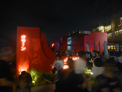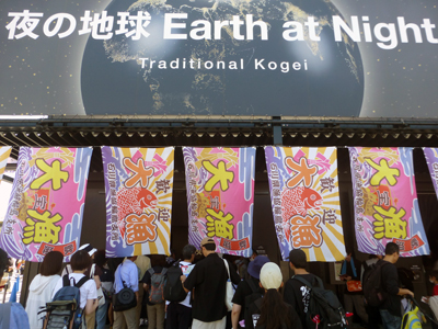 夜の地球館。能登地震からの復興を願ってつくられた石川県を応援するような館。旗は、輪島の漁船の大漁旗。 ここは並ばずに入場できた。 |
