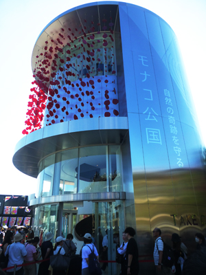 続いて、モナコ公国館。13時ごろから並び始めて、入館できたのは14時。 9月末から大混雑していることは報道で知っていたが、モナコ館で1時間待ちとはびっくり。過去3回の見学で、待ち時間の最高は、イタリア館の1時間30分、ついで米国間の1時間だったので、モナコ館で1時間とはものすごい人出なんだろう。 |