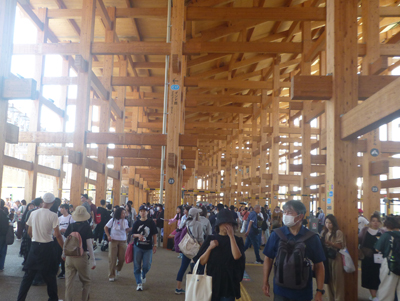 大屋根リングの下は、ものすごい人出で歩くのが大変。いくつかの館では、2時間待ち、3時間待ちだという。これはパス。さらに"規制"と称して、並ばせもしない館もいくつか。 完全予約制っていって、お高く止まっている館は最初からあきらめているが、待ち時間の長すぎる館や並ばせもしない館を除くと、いよいよ入れる館がなくなってきた。 |