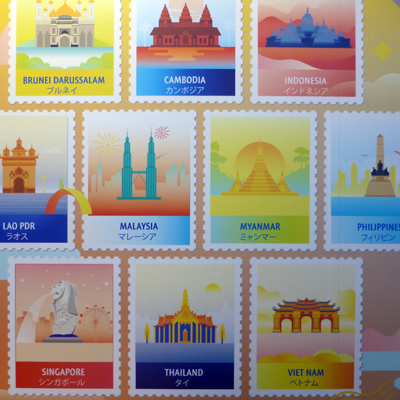 まずASEAN。自分が行った海外旅行は過去186回あるが、うち51回がASEAN加盟国で3割弱を占めていて、とてもつながりが深く、展示も興味深く見た。ASEAN10ヶ国は全部訪問しているが、圧倒的に訪問回数が多いのはタイで、一時は通うように旅していた。 今回の万博では、個別の国ごとの館で、タイ、マレーシア、インドネシア、フィリピン、シンガポール、ベトナムの6国は入館した。ラオス、カンボジア、ブルネイはコモンズでブースを見た。 写真は、各国の代表的は建造物を表している。タイ以外は何かわかるし、全部訪問した。タイだけは何なのか不明。一番よく行っている国なのに。 |