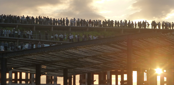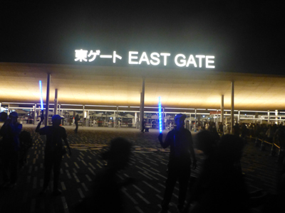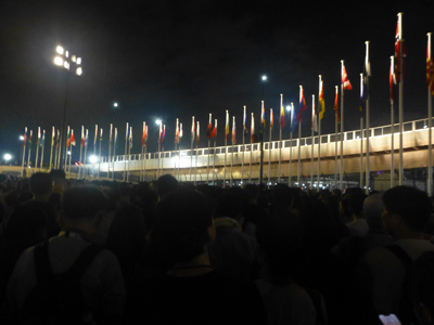 17時ごろからアンゴラ館に並ぶ。下 大屋根リングの上には日の入りを見る人たちが多数いるのが見えた。 |