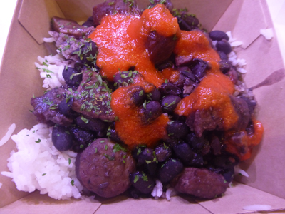 フェジョアーダ。黒インゲン豆と肉(今回の場合は鶏肉)、ソーセージなどを煮込んだもの。 ポルトガルやブラジルの食べ物として名前を知っていたが、アンゴラもポルトガル領だったので同じ料理がある。 |