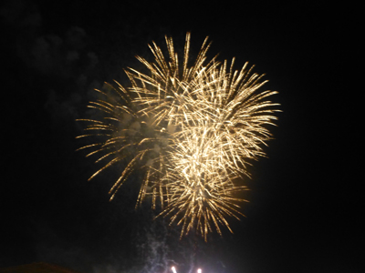 18時35分から花火。食事をしていたら、いきなり爆音。急いで食べて、1分ほど遅れて見学。 |