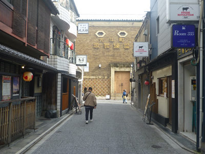 鴨川に向かって歩くと、歌舞練場が見えてくる。歌舞練場は劇場であるとともに、舞妓の練習場所でもあるので、歌舞練場という名になっている。 |