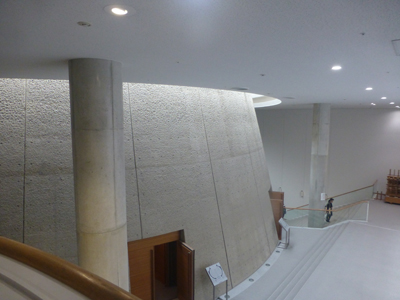 東本願寺に入り、御影堂の右手にある参拝接待所がある。この地下に、現代的建築のホールがあるとは思ってもみなかった。 |