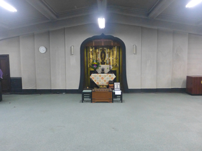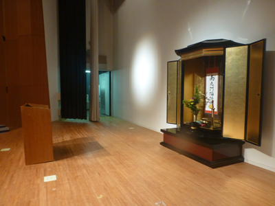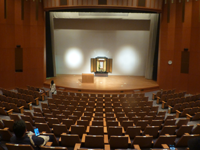 ステージ上に仏壇があるのが、一般のホールとは違う。 |