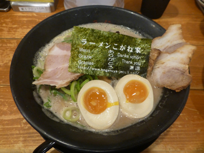 熟成とんこつトリプルチャーシュー麺味玉入。海苔に店名が書かれているのが珍しい。天下一品に近いこってり系のスープだった。 |