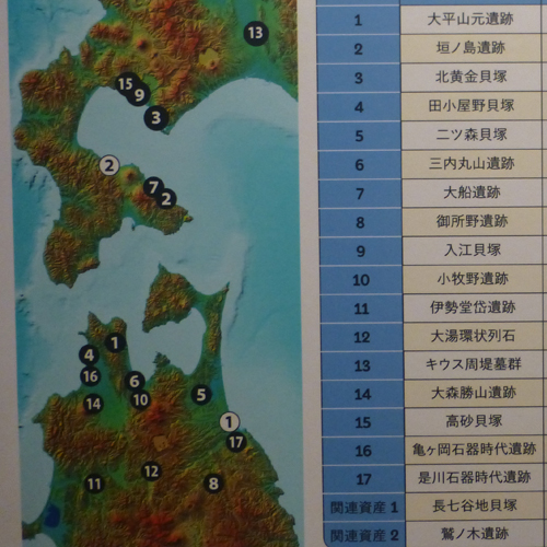 17ヶ所の遺跡から構成されているが、訪問したのは、三内丸山遺跡、大湯環状列石、亀ヶ岡石器時代遺跡の3つ。 |