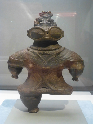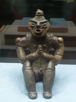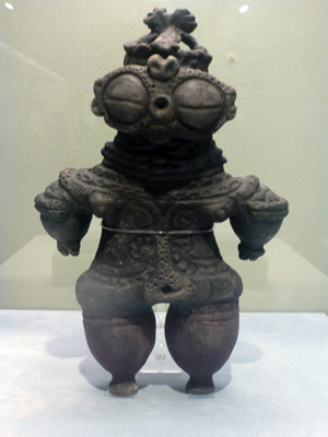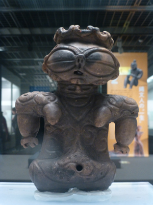 遮光器型の中がたれ目になっていて、笑っているような感じ。手も2つにわかれ、面白い恰好をしている。上部が欠けていて、中が空洞になっているのがわかるという。ただし、中がつまっているものが多い。足も欠けている。北秋田市の藤珠遺跡出土。 |