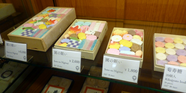 玄関を入ってすぐのところは和菓子店で、その展示品。下 きれいな干菓子が販売されている。 |