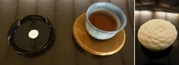 店内。(帰り際に、客が少なくなってから撮影)下 まず運ばれてくる干菓子とほうじ茶。 前回は2025年2月に来たが、冬限定の「きび餅ぜんざい」をいただいたので、今回はくずきりに決めていた。 |