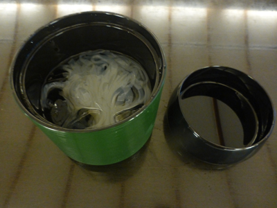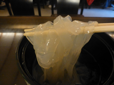 容器を開ける。氷入りのくずきりと蜜。蜜は白、黒が選べ、黒にした。 |