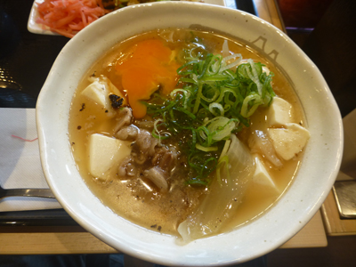 具だくさん肉吸いに生卵を入れた。肉はかなり多く、豆腐、玉ねぎ、ねぎがたくさん入っている。味付けはかなり甘い。もともと、肉吸いは大阪発祥なので大阪風の甘いだしだ。 |