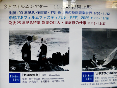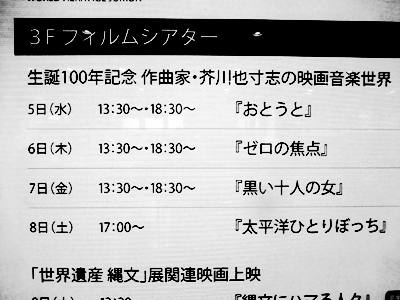 作曲家・芥川也寸志の生誕100年記念で、彼の作曲した映画音楽を使った映画の上映を行っているようだ。この日は、原作松本清張、監督の野村芳太郎の1961年製作「ゼロの焦点」。 |