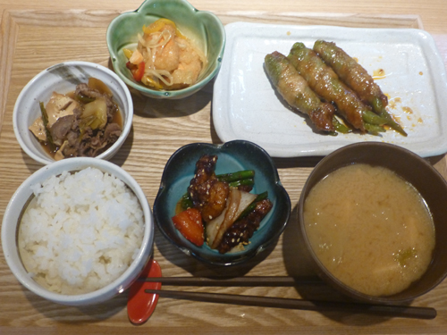 運ばれてきた定食。選んだのは、肉豆腐、鮭のマリネ、唐辛子肉巻き、酢豚。唐辛子肉巻きを主菜にしたが、一番美味しかった。 |