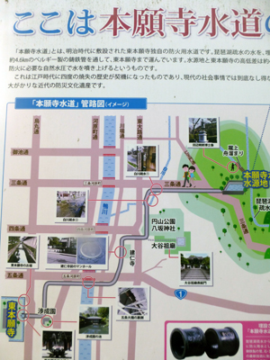 池の前の看板にあった本願寺水道のルート図。水道自体びっくりしたし、こんなところを通っていることにもびっくり。 |