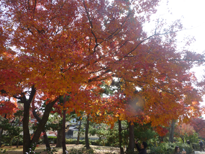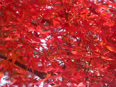よかった。まだ見ごろだ。紅葉を見ながら、境内を南に歩く。建物内の見学は、一番南まで行って、引き返してからにする。 |