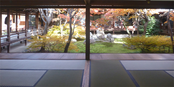 方丈からスリッパを履いて、法堂へ。天井に双龍図が2002年より掲げられている。 建仁寺は、紅葉が目的で行ったが。思ったよりも広く、内部も見るところが多くてよかった。 |