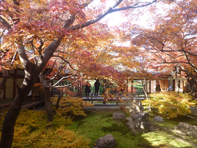 建物は、あとで庭園を見る方丈。この側も見ごろを過ぎているが、まだ紅葉っぽい感じだ。 |