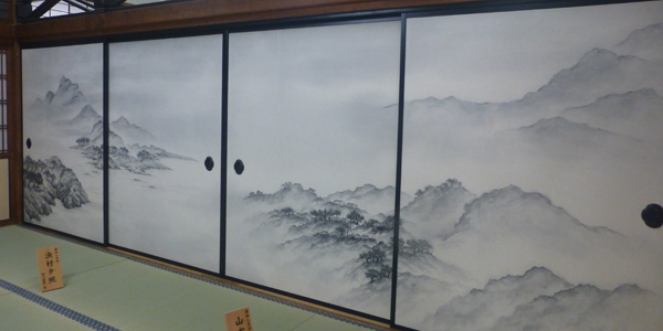 近くで見る。下 潮音庭の北側の大書院の襖絵は、細川護熙元総理が描き、2021年に奉納されたもの。 |