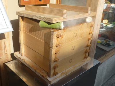 寿司屋の前で、せいろから湯気が出ているのが目に入った。。近寄ると「蒸し寿司」だ。実際には、これはショーで、ここでは蒸していないが急に「蒸し寿司」が食べてみたくなり、この店で昼食をとることに変更。 |