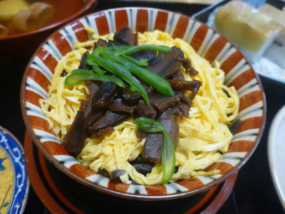 「蒸し寿司」はほかの店でも食べたが、そのときは、ちらし寿司を蒸したものだったので、それをイメージしていたが、この店は、違った。醤油をまぜた酢飯にあなご、きくらげを混ぜたご飯を蒸したものだった。 |