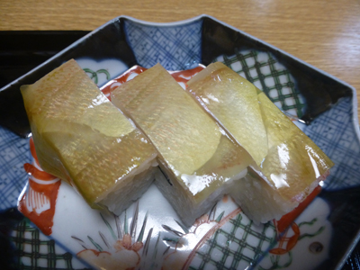 稚鯛かすご寿司。鯛寿司との違いがいまいちわからなかったが、柔らかい鯛で美味しかった。 |